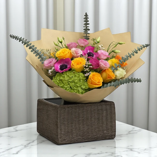 Celebrate life’s precious moments with the radiant Twilight Blossom Flowers from Online Flower Shop Dubai. This enchanting bouquet includes 5 yellow roses, 7 pink roses, 1 white rose,1 hydrangea, 1 orange rose, and 2 special flowers, enhanced with fresh green fillers. Each bloom is handpicked to create a vibrant harmony of colors and textures. Perfect for Birthdays, Women’s Day, Anniversaries, or any special occasion, this arrangement beautifully expresses love and happiness. Moreover, our expert florists design every bouquet with care and creativity for a truly elegant presentation. Order now and experience fast, reliable flower delivery across Dubai. Add warmth, beauty, and emotion to every celebration with this stunning Twilight Blossom Flowers arrangement.