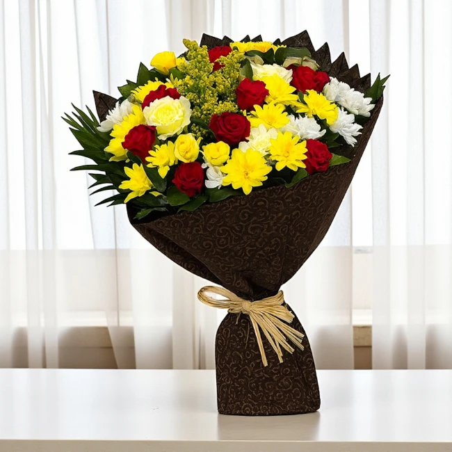 Radiant Bloom Symphony from Online Flower Shop Dubai brings joy to every celebration. This stunning bouquet features 8 red roses, 10 yellow chrysanthemums, 10 white chrysanthemums, 3 baby roses, yellow gypsophile, and fresh green fillers. Carefully hand-picked, each flower combines beautifully for a cheerful and vibrant display. Ideal for birthdays, anniversaries, Women’s Day, or any special occasion, it instantly brightens homes and hearts. You can also include a personal note to make your gift unforgettable. Moreover, Radiant Bloom Symphony is arranged with care to ensure premium freshness. Order now and enjoy same-day delivery across Dubai. Let this elegant bouquet express your love, happiness, and appreciation vividly.
