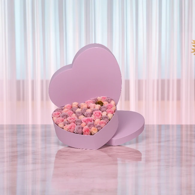Experience timeless beauty with the Eternal Bloom Roses Box from Online Flower Shop Dubai. This elegant arrangement features 17 purple roses, 15 baby pink roses, and 20 white roses, perfectly blended to create a graceful display of love and sophistication. Each bloom is handpicked to ensure freshness, rich color, and fragrance that lasts.